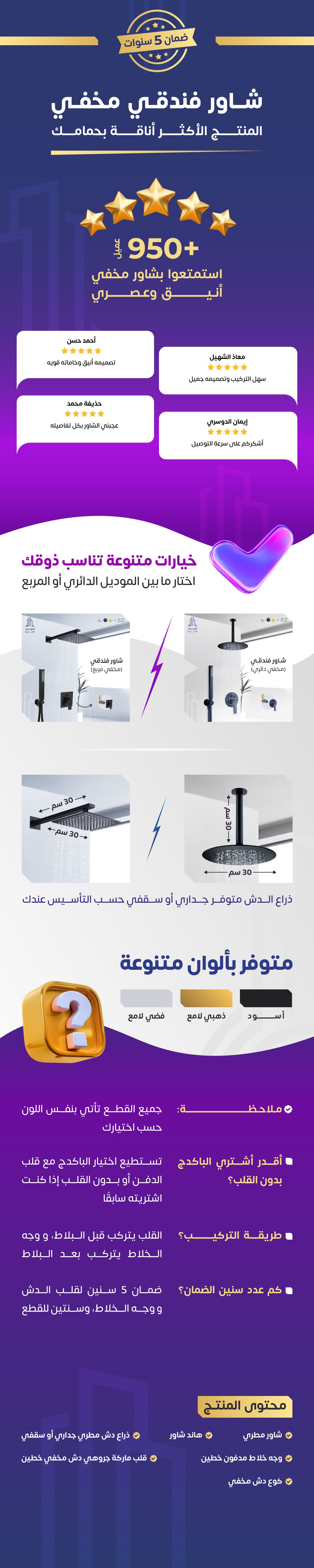 شاور مطري مخفي هو الحل المثالي لتحويل حمامك الى تجربة سبا فاخرة. شاور مطري يتمتع بتصميمه الأنيق والمبتكر الذي يتيح تركيب رأس الدش بشكل مخفي في السقف، مما يوفر مظهراً سلساً وعصرياً.شاور مطري يتيح لك الاستمتاع بتدفق مياه يشبه المطر، ليقدم لك لحظات استرخاء لا مثيل لها. سهل التركيب والصيانة، ويضيف لمسة من الفخامة لحمامك.